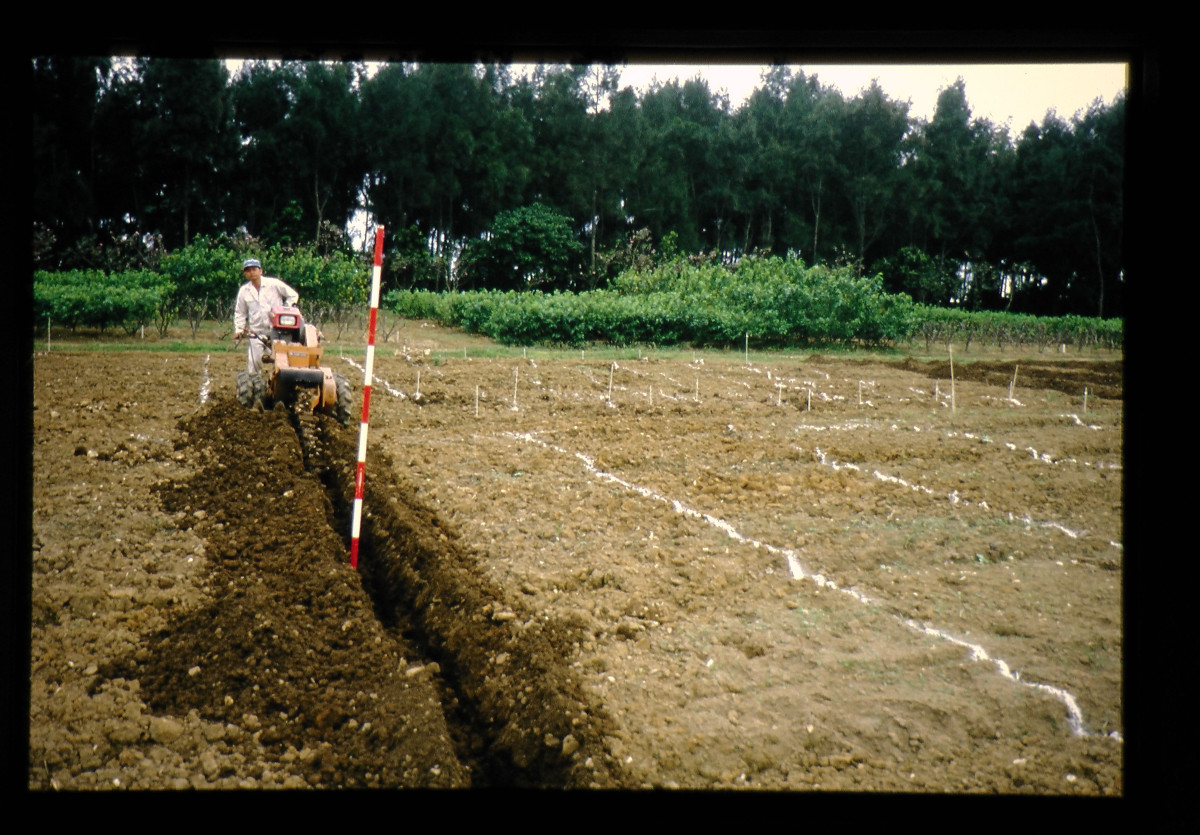 桑は永年性作物であるから、有機質を充分施す必要がある。そのために裁植距離が決まったら線引の後、深さ40cm程度の植溝をトレンチャー等で掘る。