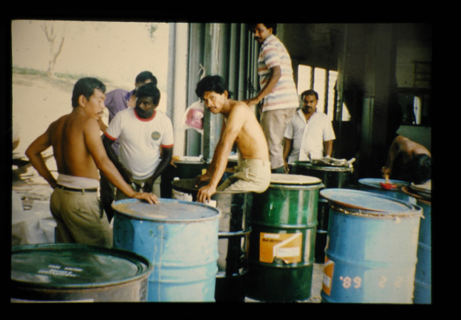 オイルパーム幹は水分含量が高く乾燥が困難なため高水分のままサイレージ貯蔵した方が有利であるのでサイレージとしてドラム罐内に貯蔵しているところ。