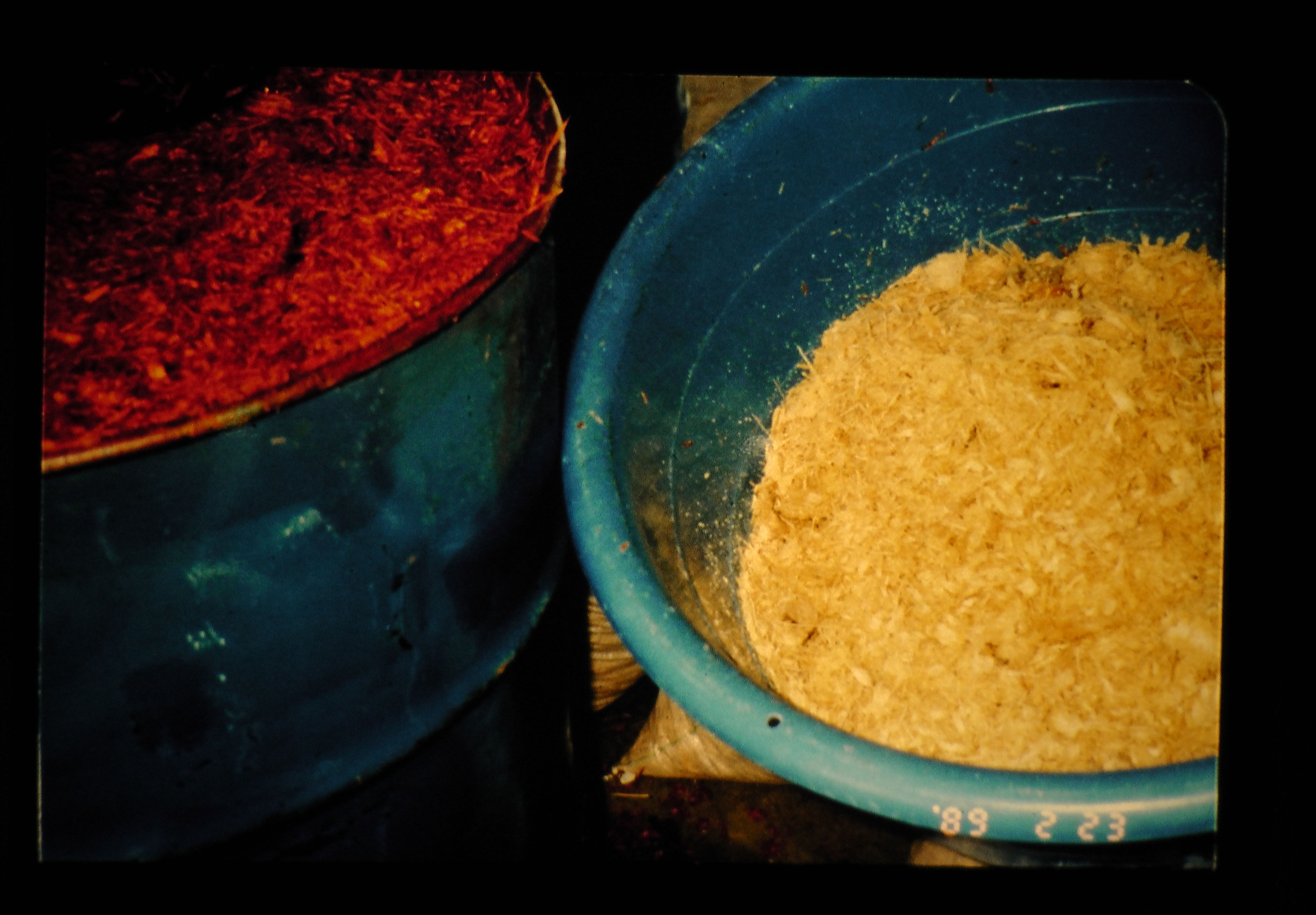 左側がNaOH処理したオイルパーム幹(OPT)、右側が未処理の新鮮OPTである。アルカリ処理することによりOPTの細胞壁が破壊され、消化率が向上する。NaOH最適含量は乾物の約7%である。