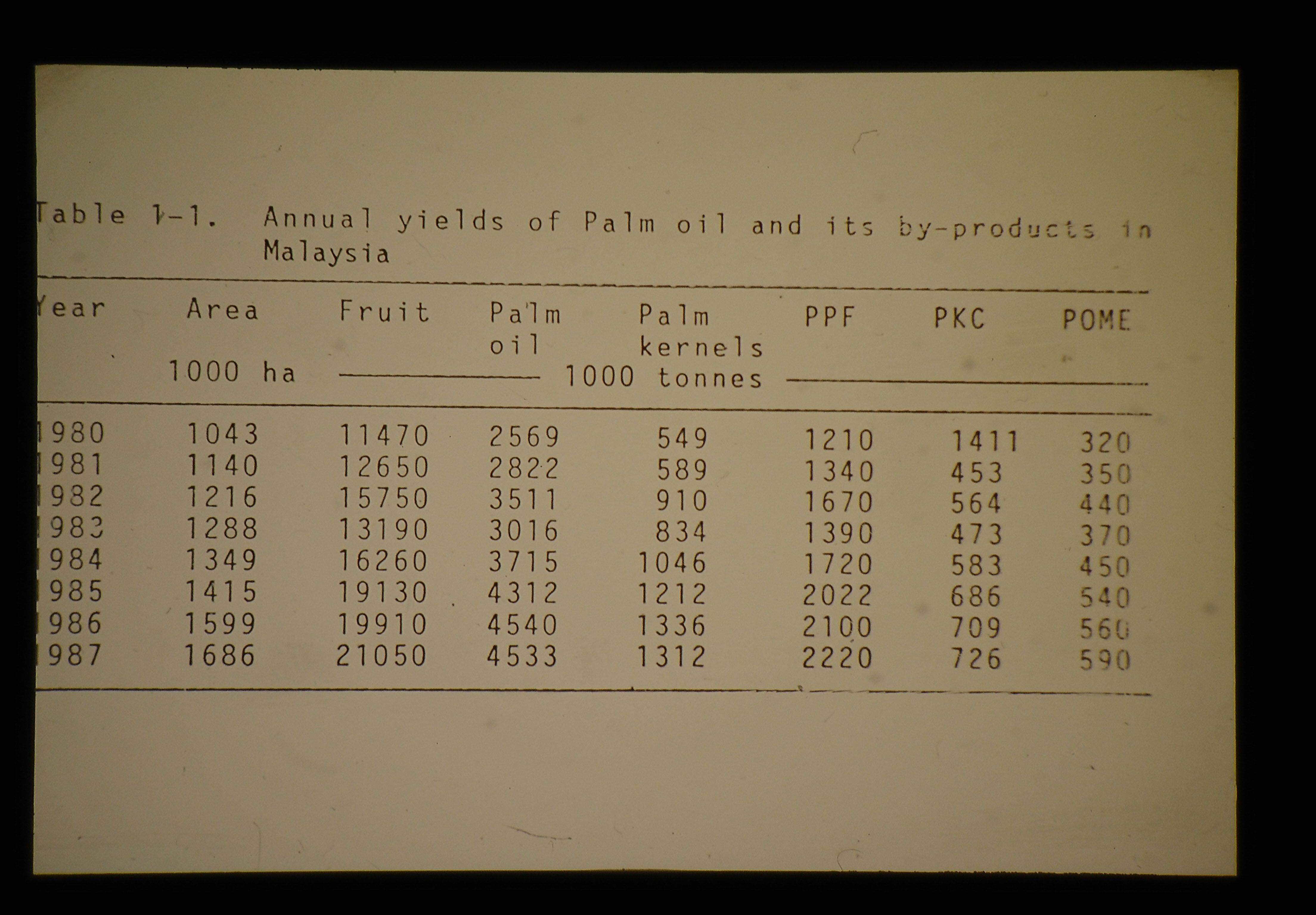 マレイシアにおけるパーム油及びその副産物の年次推移(表)1980-1987 = Annual Yields Of Palm Oil And Its By-products In Malaysia 1980-1987