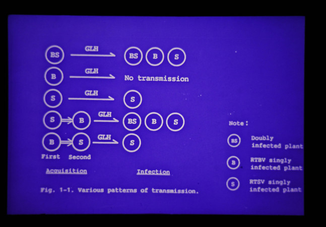 ウイルス伝搬の模式図。RTSVは単独でも伝搬されるがRTBVの伝搬は、媒介虫が事前又は同時にRTSVを吸汁する必要がある。