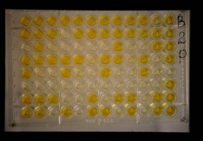 接種後3~4週間に葉身を磨砕し、ELISAで検定する。黄色に発色している穴(WELL)の試料にはウイルスが含まれている。RTBV、RTSVそれぞれの血清が用意されていて、一つの試料を両ウイルスについて検定する。