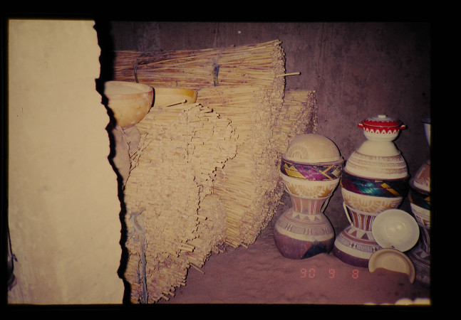 農地整備公団実証圃場のあるマグー村の農家の内部。ミレットの茎が貯蔵してあった。