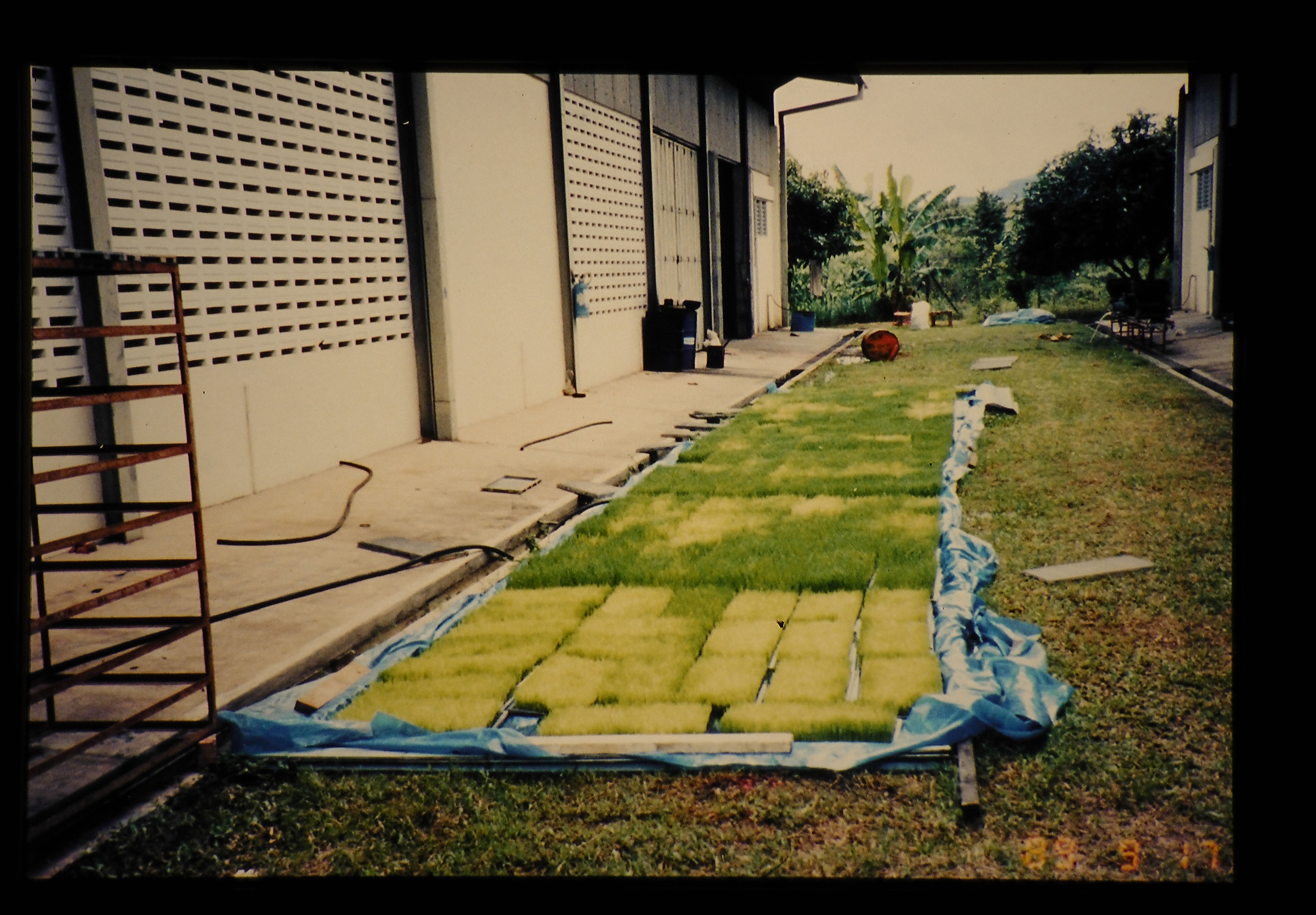 マレイシアで試験的に導入されている機械田植用の育苗施設(育苗した苗)。