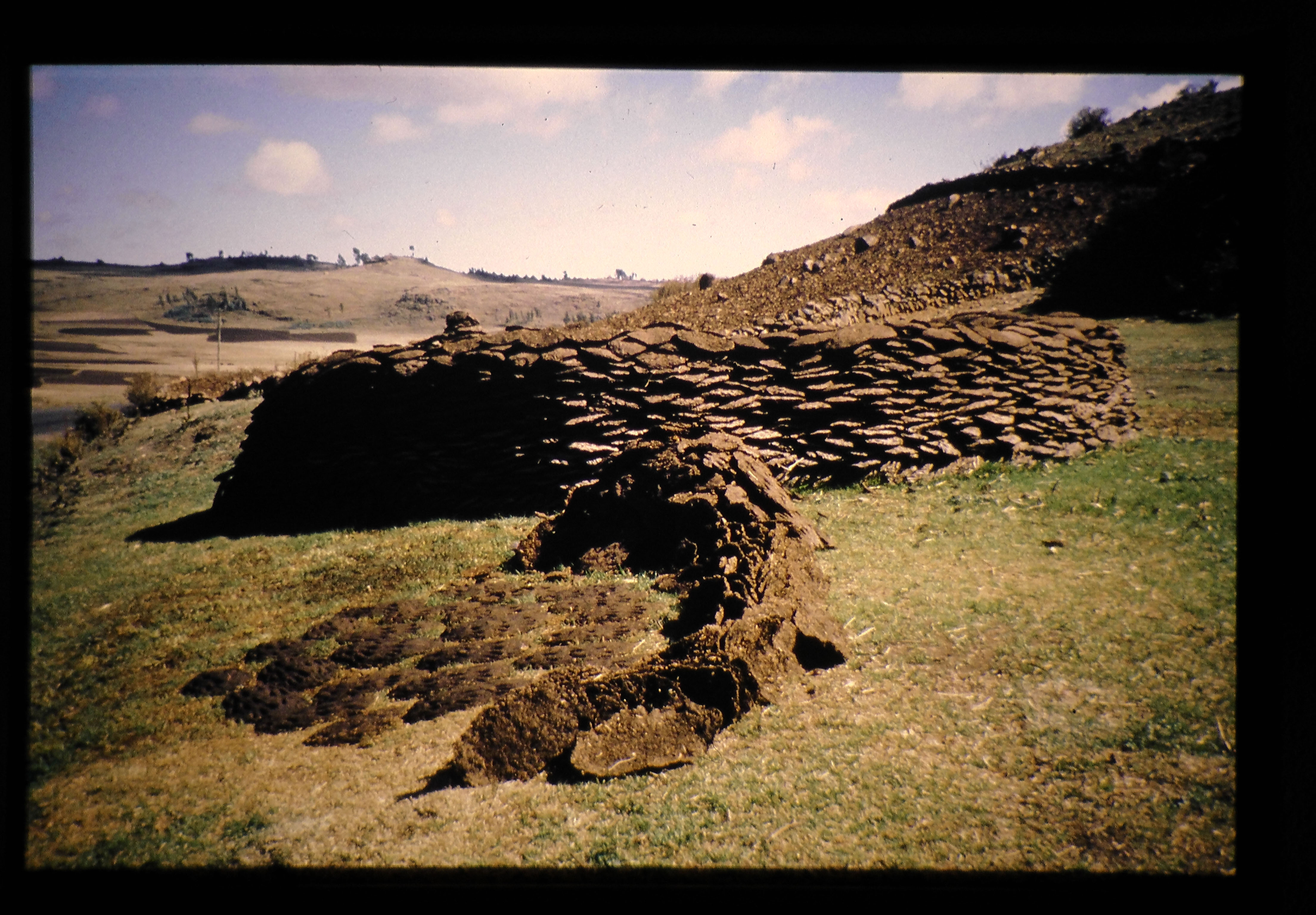 エチオピアにおいては、家畜のもつ力を最大限に生かした生活様式が作られている。国のどこに行っても、多くの家畜と人に会うことができる。スライドは牛フンの乾燥風景である。燃料となる木が少ないため、牛フンを燃料にしている。