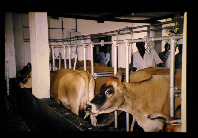 ケニアのインド洋岸のモンバサにおける、小規模な酪農家の状況。飼育品種はSAHIWALとBROWN SWISSの交雑種。ココナツのカラを敷ワラ代わりに使っていた。