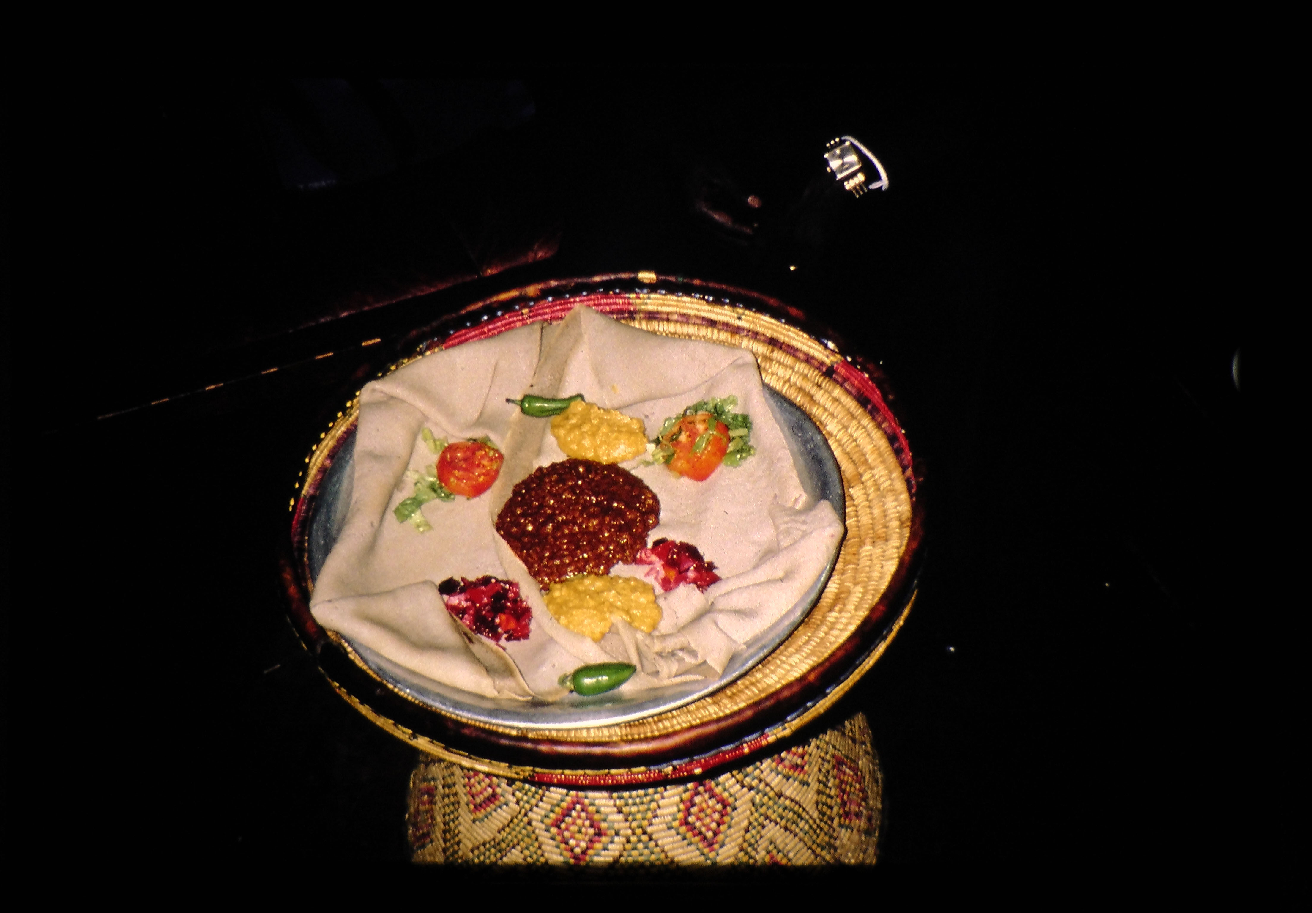 エチオピアで牛の果たす役割は極めて大きい。主食であるインジェラの原料のテフを収穫するために牛の力を利用している。スライドは、エチオピアの代表的食べ物のインジェラ。