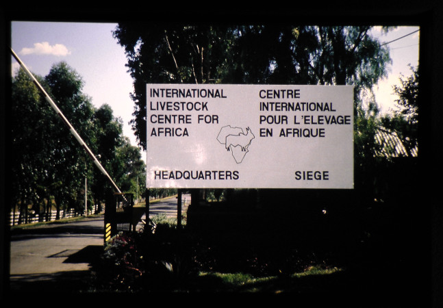 ILCA(INTERNATIONAL LIVESTOCK CENTER FOR AFRICA)アフリカ国際畜産センターは、アフリカにおける畜産の改善につづいて総合的な研究を行なうために1974年に設立された国際研究機関である。スライドは、ILCAの本部のゲートである。