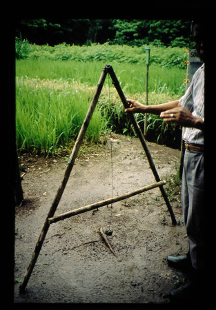 傾斜地農業を行なう際、まず等高線に畝を切る必要がある。この装置(A-FRAME)は簡単に等高線を引くことが出来る。A型の木わくの中心に石をつけた糸をたらし、中心を通るように調節して等高線を決める。