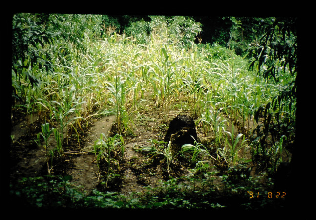 木の下のトウモロコシの生育は貧弱で、木の葉からの雨滴によって倒伏している。