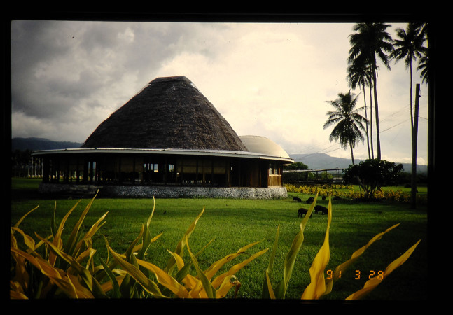サモアの伝統的な建築様式によって建てられた共同施設。