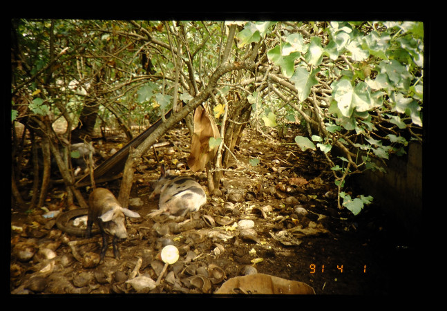 農家。裏庭で飼われている豚。ちゃんと囲いが巡らされており、ココナッツの実などを与えている。