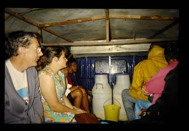 毎朝トラックで、絞った牛乳を売りに出かける。計り売り。左手前がオーストラリアから赴任してきた校長。