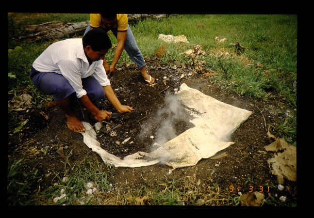 料理が汚れないようにシートをかぶせ、それから土を乗せ、蒸焼きにする。