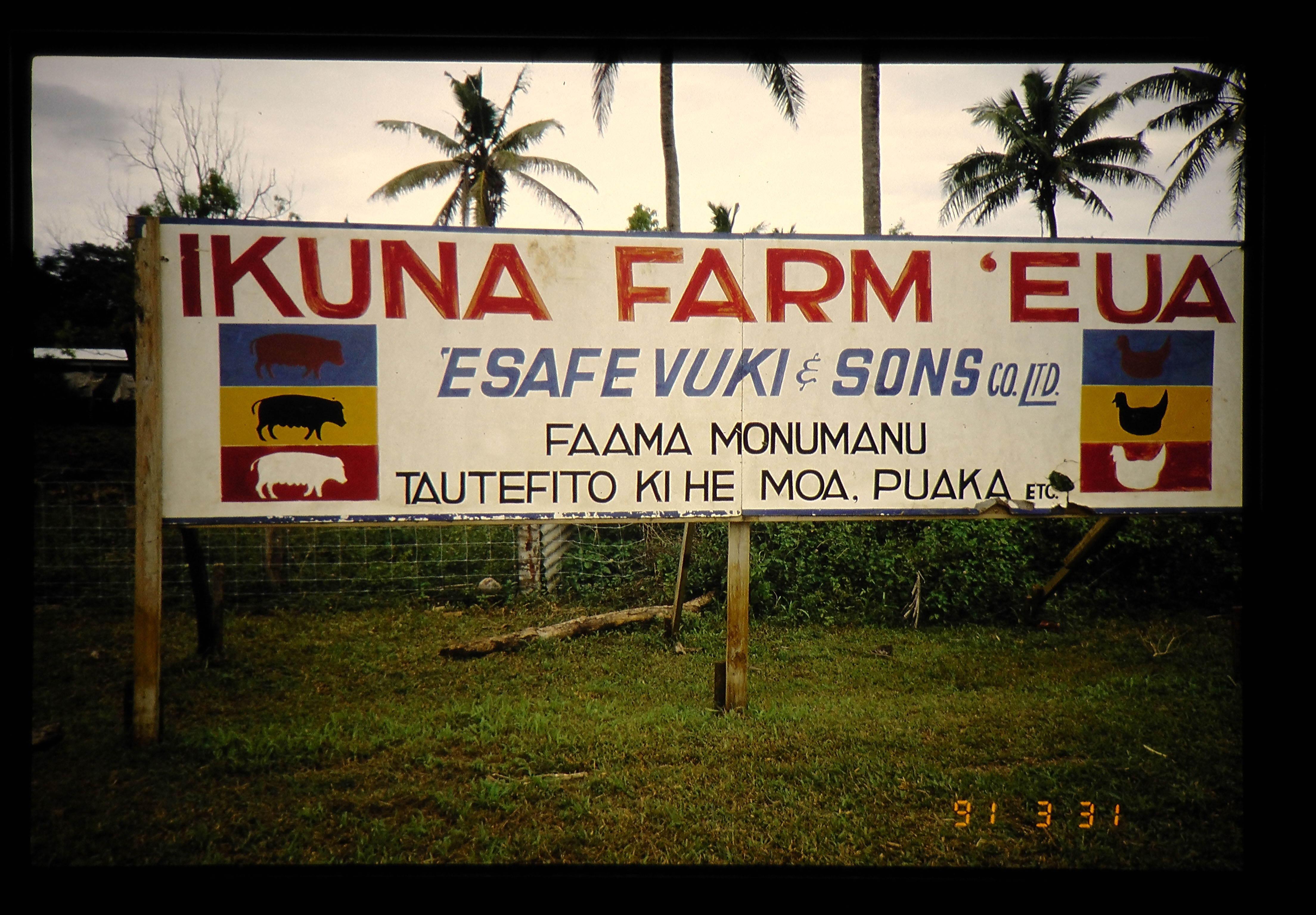エウア島で見かけた農場の看板。豚や鶏を飼育、出荷している。