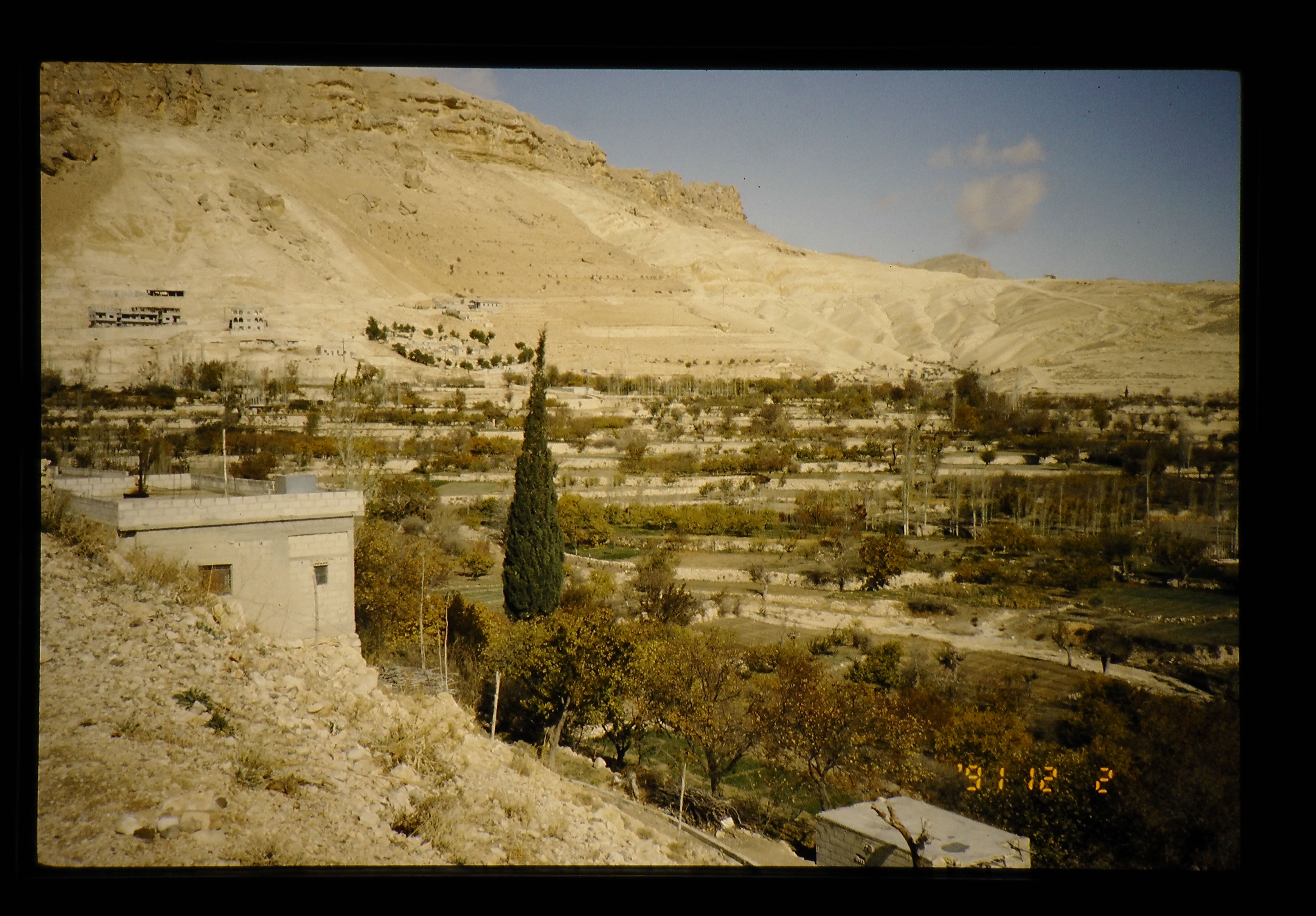植生の極めて緑の少ない乾燥地にまるでオアシスでもみるように、やや低地に緑地帯がみられ、そこには、果樹の栽培がみられる。