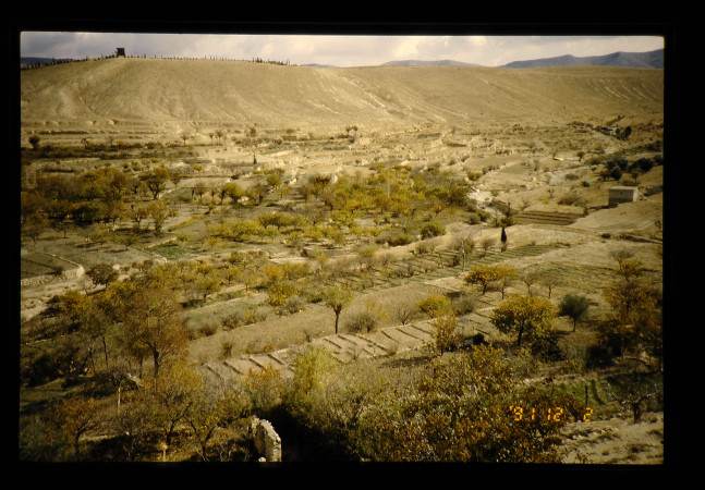 植生の極めて緑の少ない乾燥地にまるでオアシスでもみるように、やや低地に緑地帯がみられ、そこには、果樹の栽培がみられる。