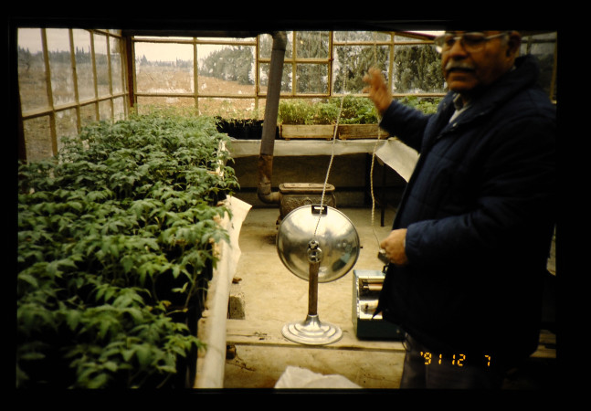 アレッポ大学農学部の付属農場,手作りのファイロンハウスの中に電熱器を持ち込んで加温し、トマトの苗作りをしている。
