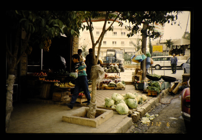 シリアのアレッポ。裏町の通りに露天の八百屋の品物