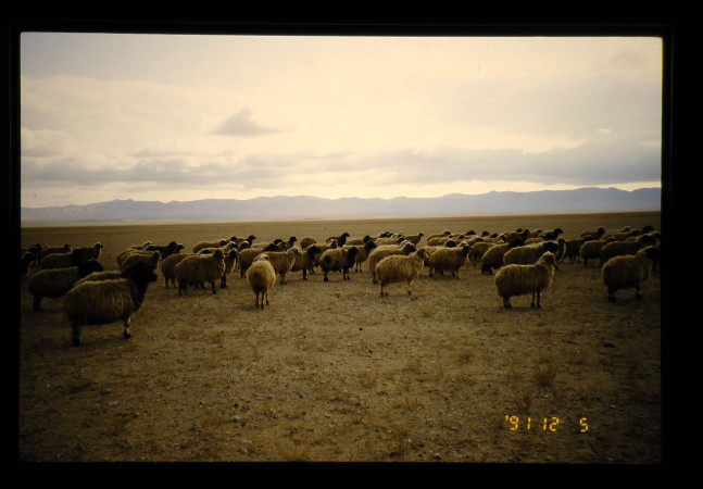 遠くからみると草一つない土漠に羊が放牧されているように見える。側に寄ってみると、褐色に枯れ上がった僅かな草を食べていた。