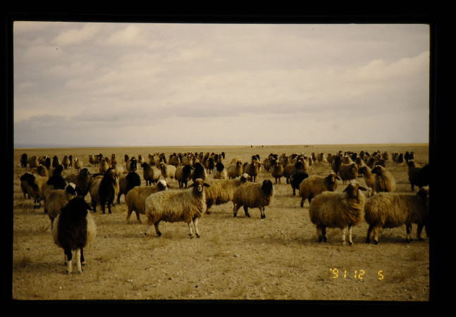 遠くからみると草一つない土漠に羊が放牧されているように見える。側に寄ってみると、褐色に枯れ上がった僅かな草を食べていた。