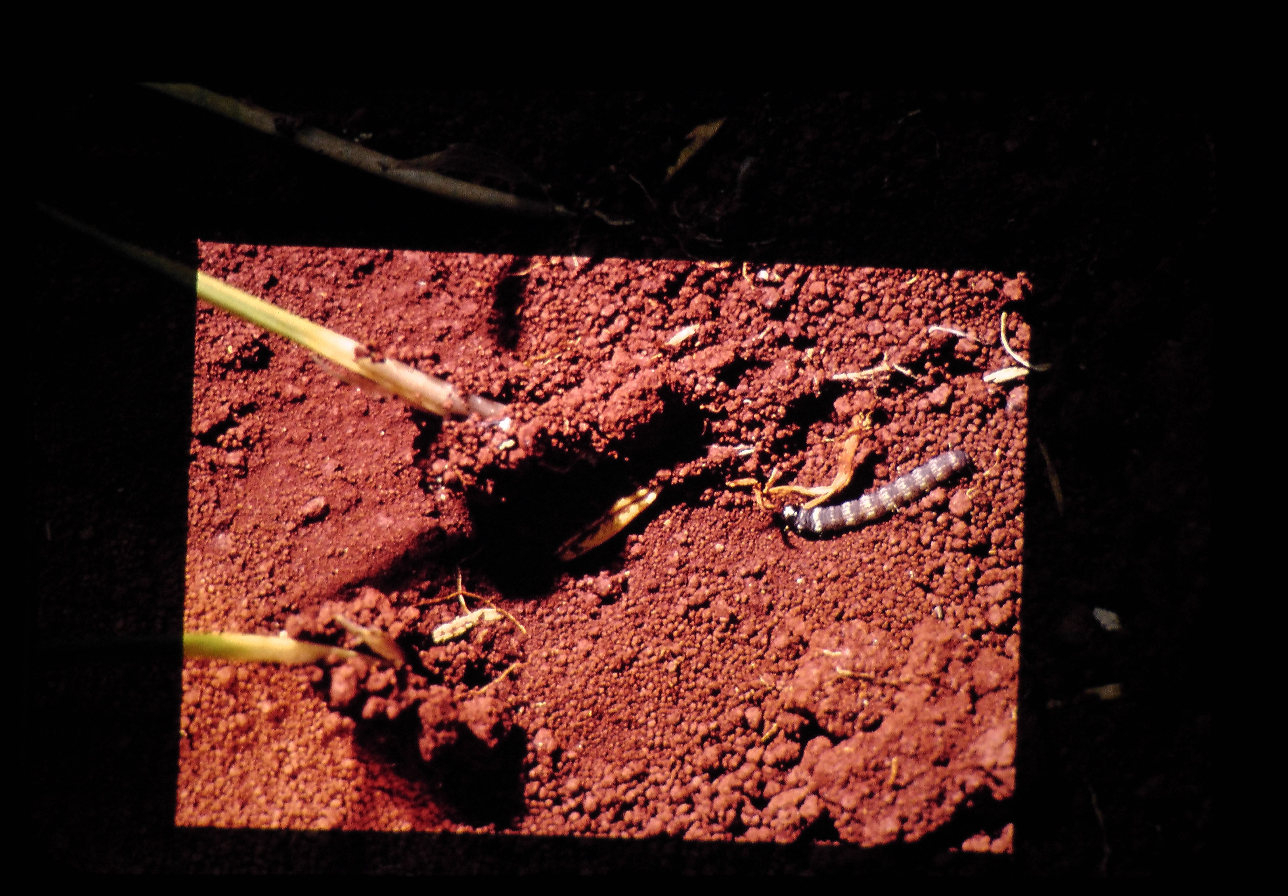 モロコシマダラメイガ(Lesser comnstalk borer、 Elasmopaipus lignosellus Zeller)はアメリカ大陸特有の畑土壌害虫で、干ばつ条件下で種々の作物に大被害を及ぼす。卵は地表直下に産付され、幼虫は地表直下で作物の茎内に食入して加害することが知られている。本研究はパラナ農業研究所と共同研究により昭和54年度~昭和59年度にかけて、陸稲における本害虫の被害発生の機作を解明し制御法の基礎的資料を得ることを目的として実施された。
