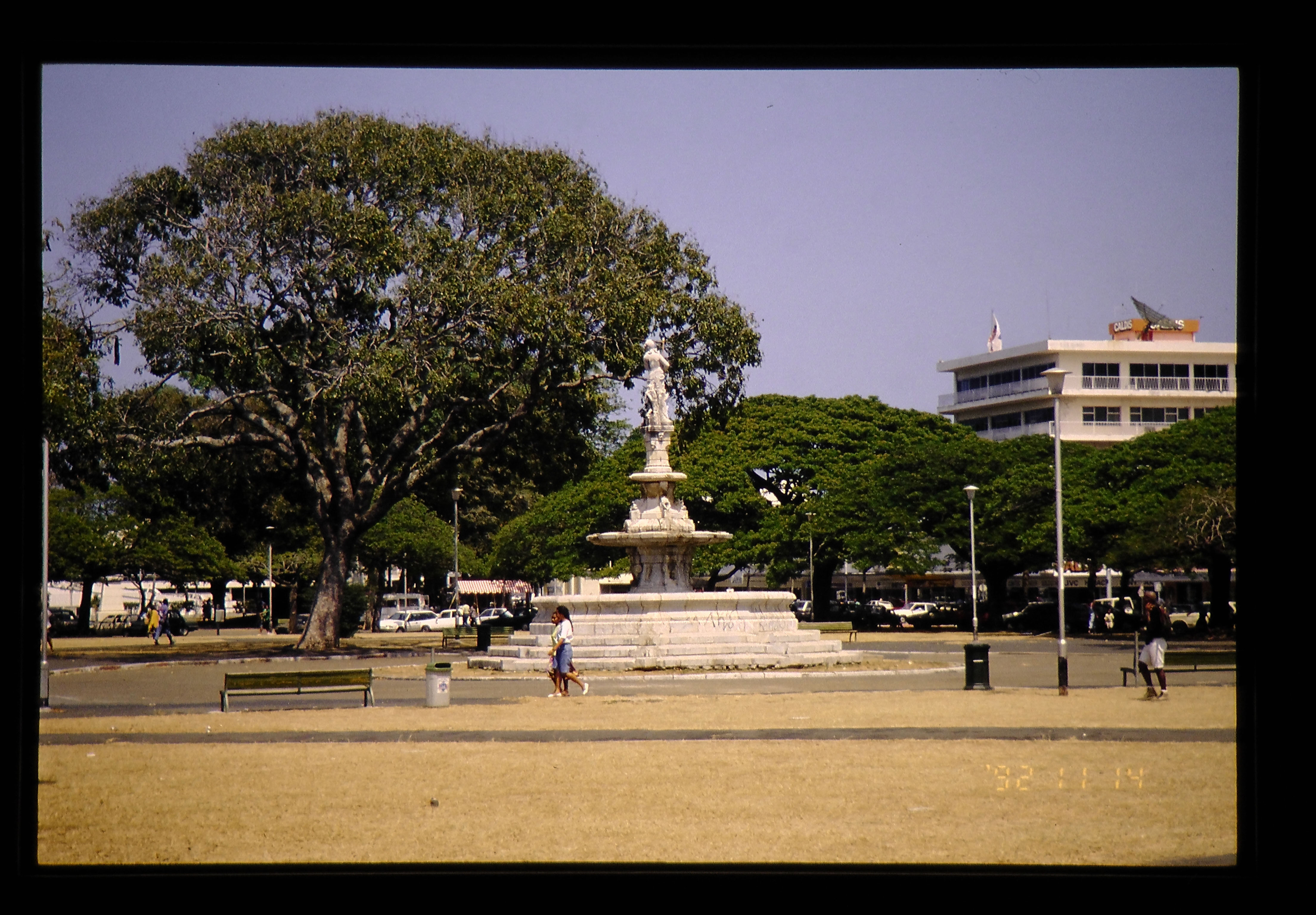 街の中心にあるココティエ広場。まわりには火焔樹が植えられており、11~12月には真っ赤な花を付ける。大人が5人ほどで、ビー玉をソフトボール球大の鉄の玉にかえて遊んでいる(ペンタクという)。