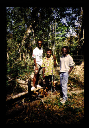 農民(中央)。両端は案内してくれた人。ブッシュナイフ一つで林を伐り開いて、放牧地とする。