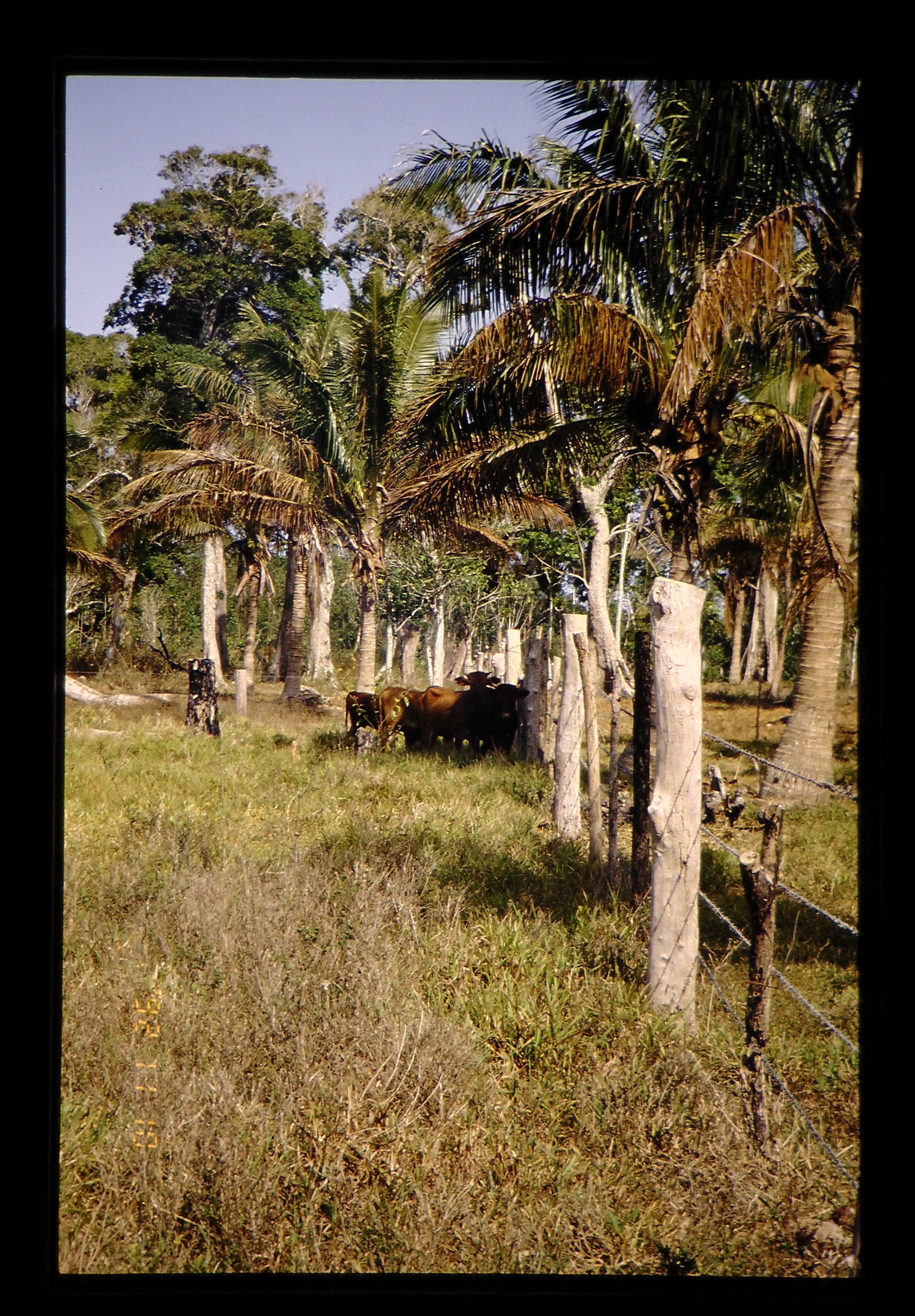 農家の放牧地。林を伐り開いて、牧棚をめぐらし、牧草を導入。20-30頭の牛を飼っている。乾期の終わり頃で、草は半分枯れかかっている。