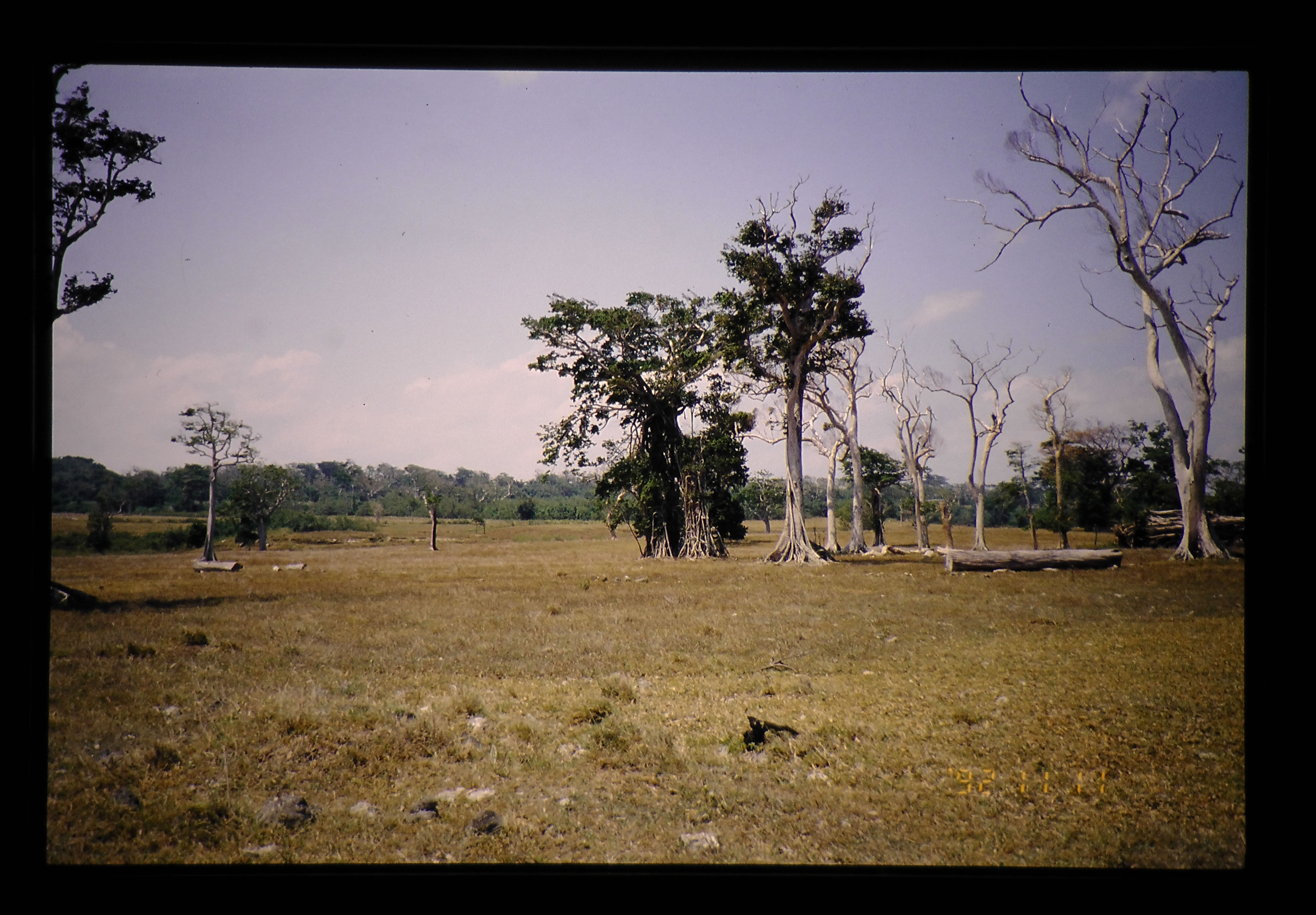 広大な牧場(OPEN RANCH)。乾期の終わり頃とかで、草生はあまり良くない。大木がポツン、ポツンと残っている。