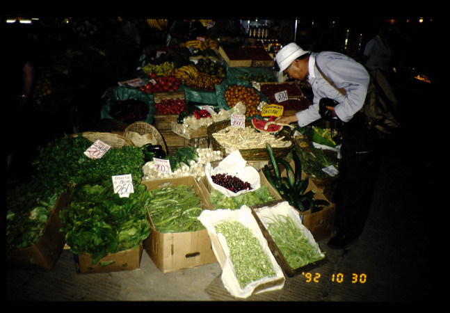 中央マーケットには珍しい各種の野菜がある。石原情報官が熱心に色々な野菜を見ている。