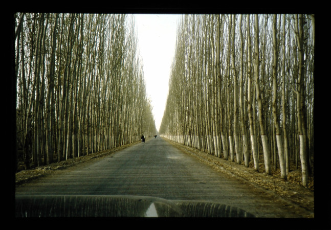 中国和田(ホータン)のオアシスを形成するための極めて重要な役割を果たしているポプラの防風林の状況である。道路沿いには防風林が多く植えられているが、周辺の乾燥地の砂漠地形とは大きく異なる。