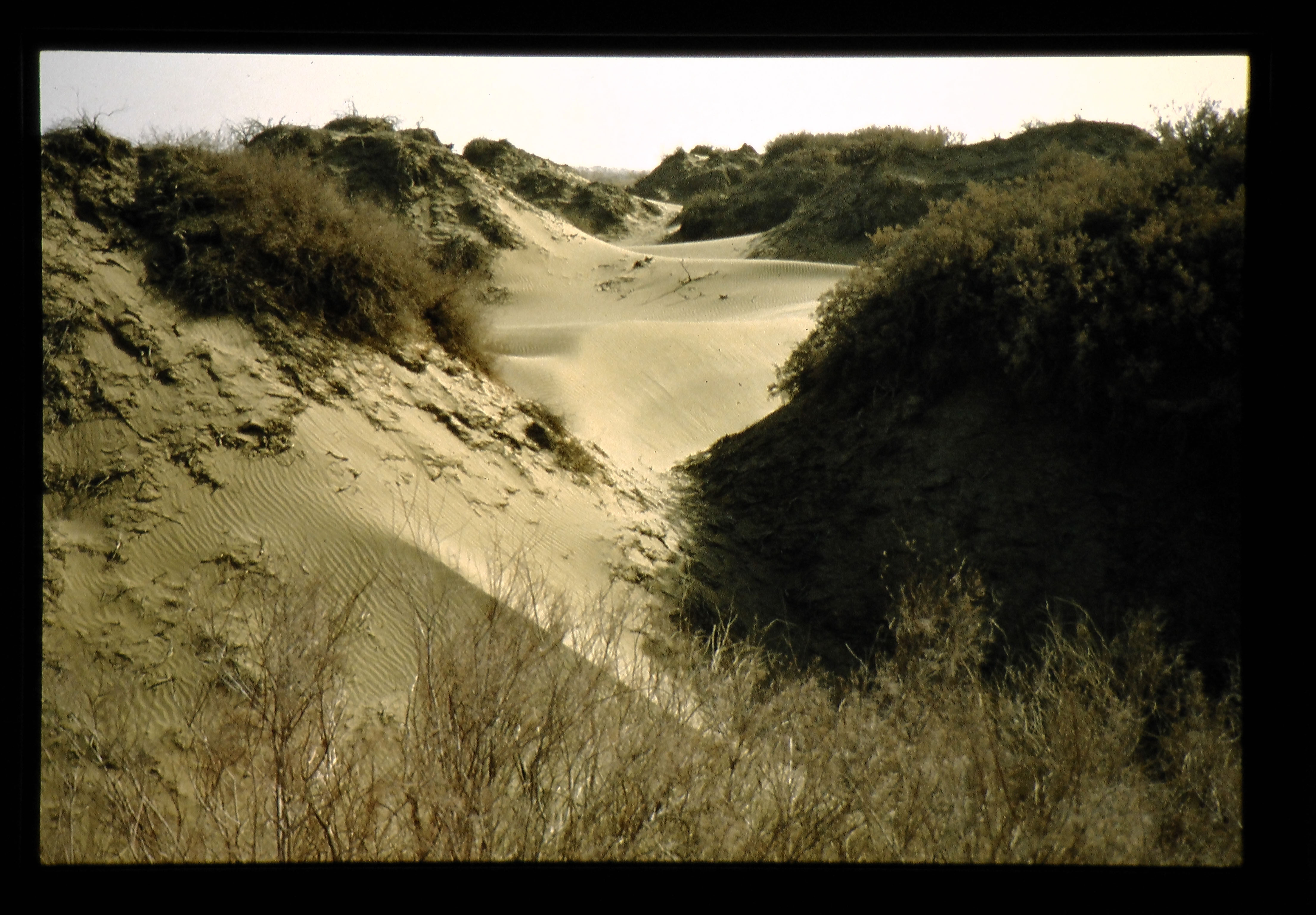 中国のタクラマカン砂漠南部地域の砂漠化しつつある地形を示す。植生のある所は砂が着き、次第に高くなって砂塚(ネブカ)を形成するが、水が足らなくなって植生が枯れ始め、そこの砂が活動を始めた状態である。