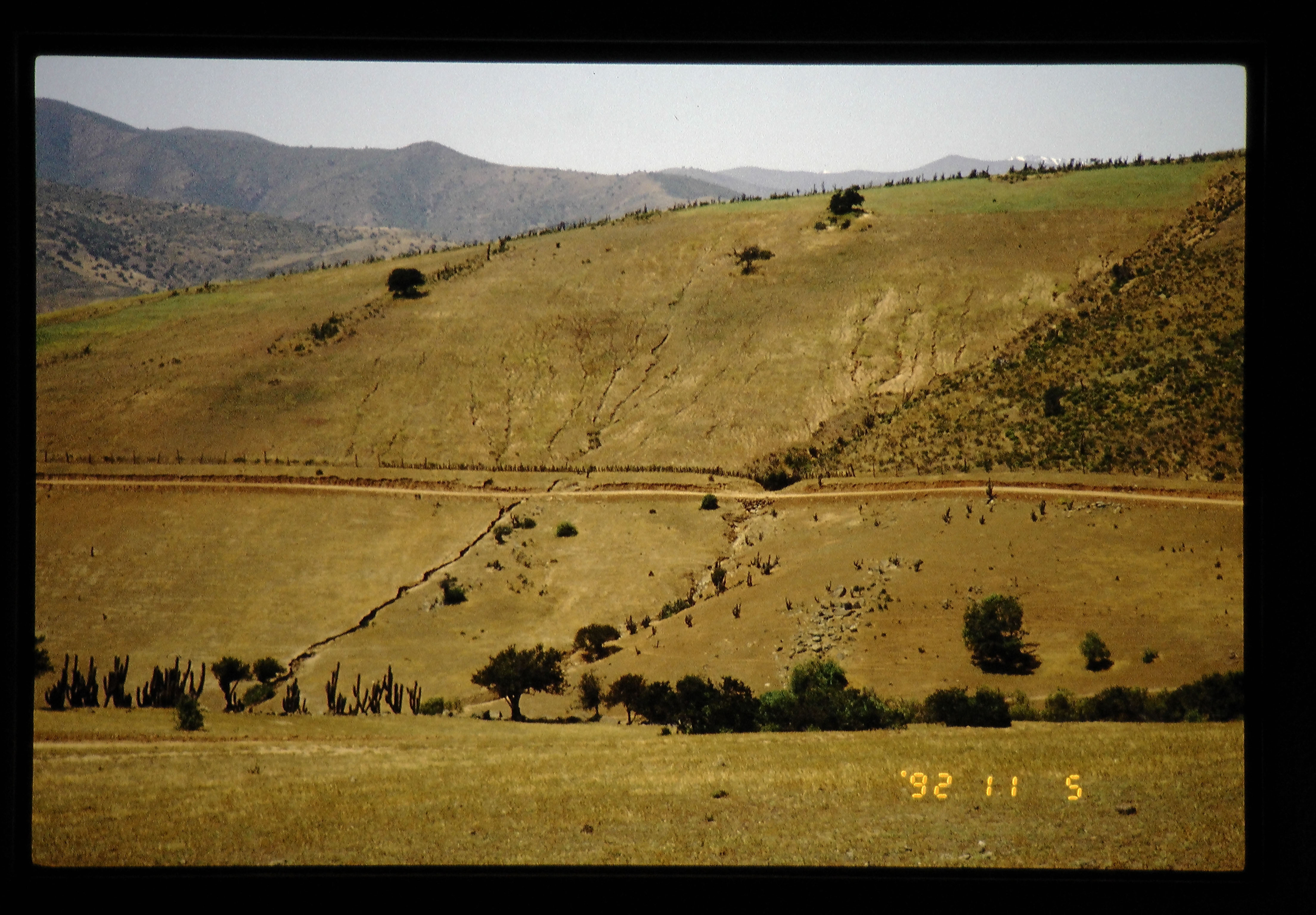 雨があまり降らないこのようなところでも斜面のあちらこちらに土壌侵食のつめ跡がみられる。