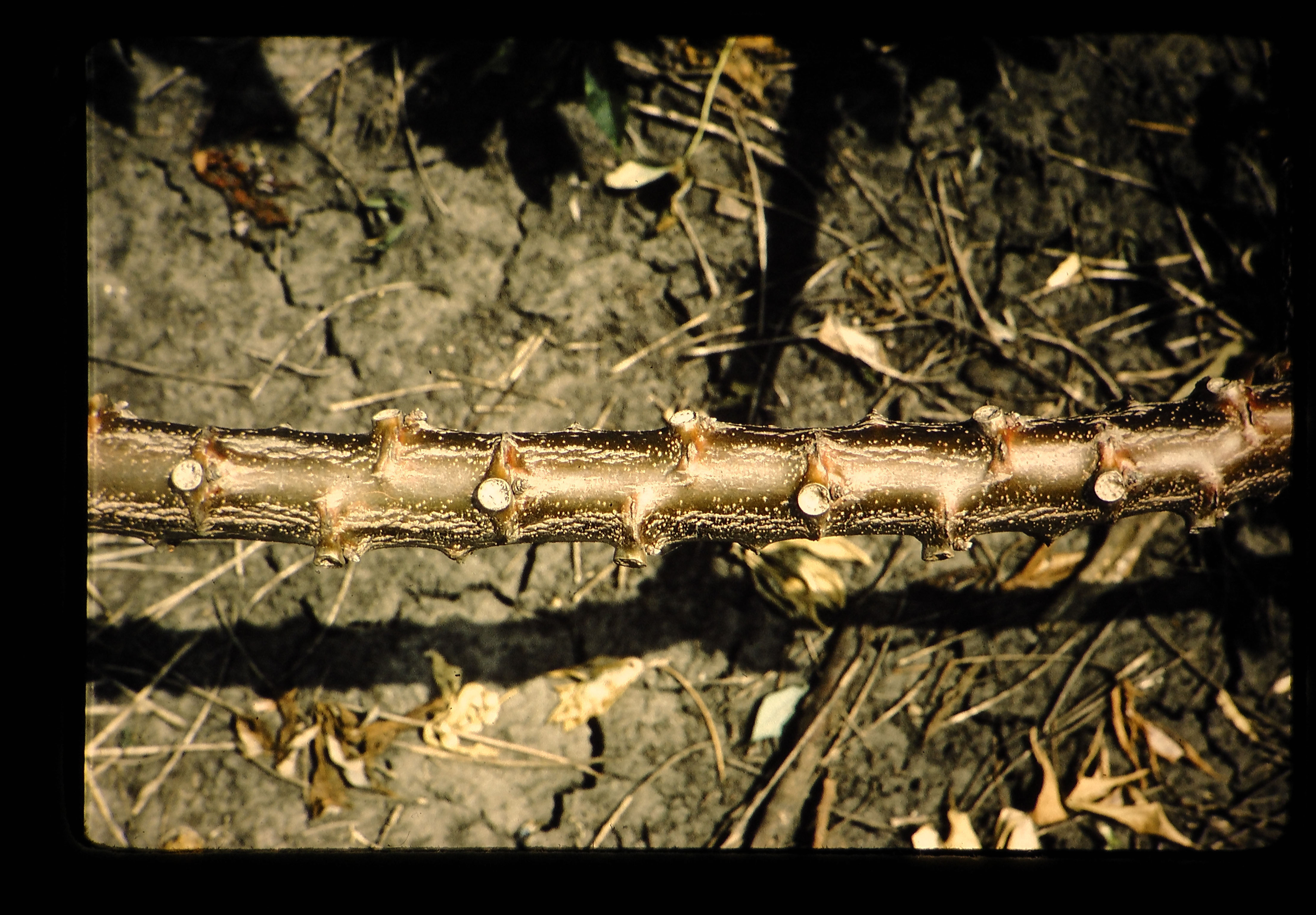 キャッサバの開度は1/5である。すなわち5葉で1回転する。節数を調べるときには直線上に並んだ葉痕を数え5倍すると便利である。