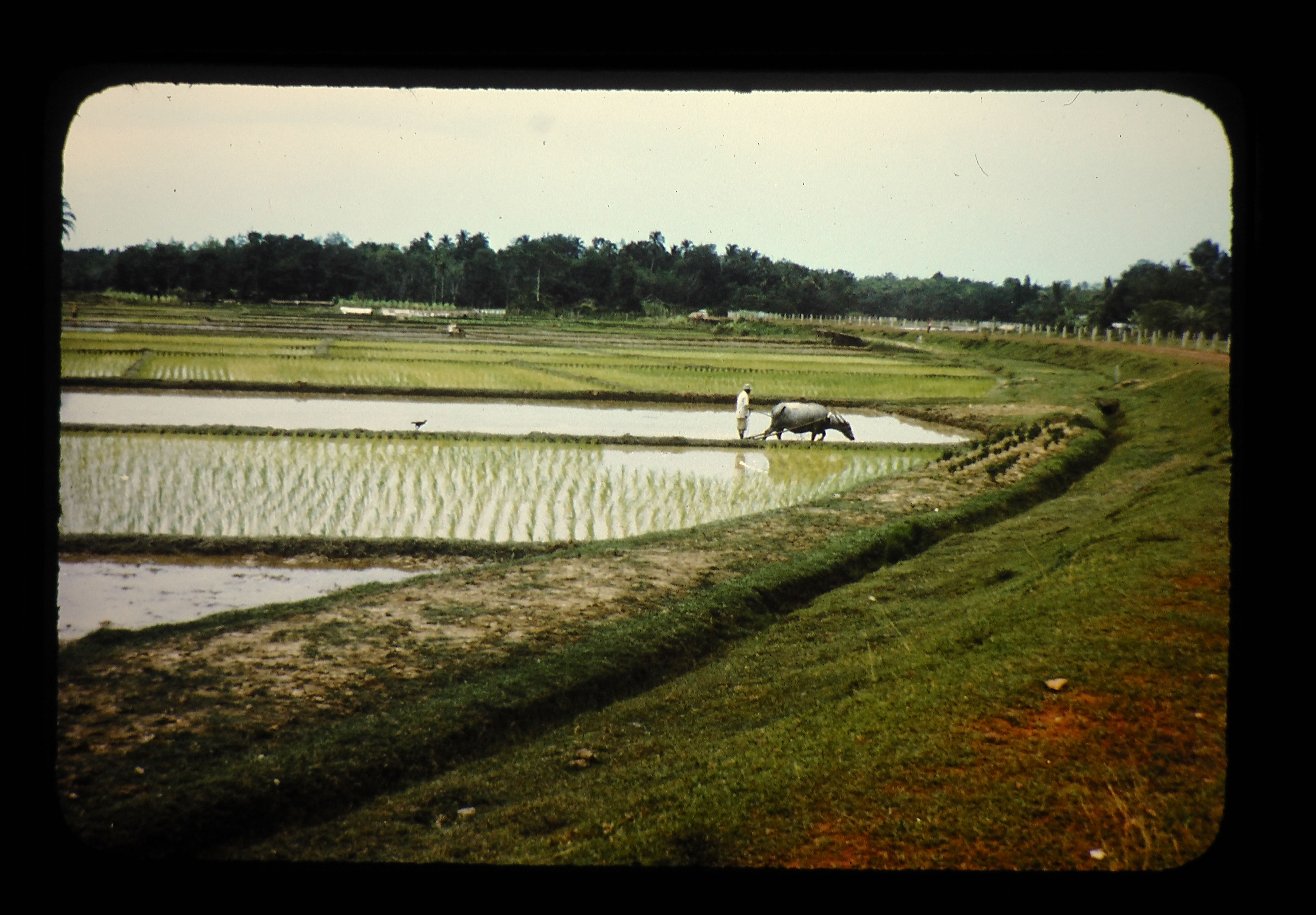 コタバル周辺の水田風景(西海岸では少なくなった水牛による代かきと小型耕転機.遠景)