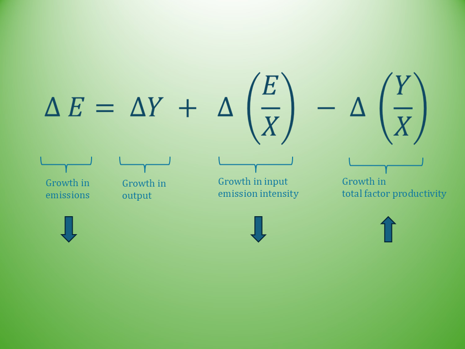 Science誌に掲載された論文は、農業におけるGHG排出量の増加(△E)を、生産量(△Y)、投入量あたりの排出量(△E/X)、そして投入量あたりの生産量(△Y/X)、と、全要素生産性(TFP)の3つの部分に分解し、公式の国レベルのデータを用いて、これらの構成要素の寄与を定量化しました。