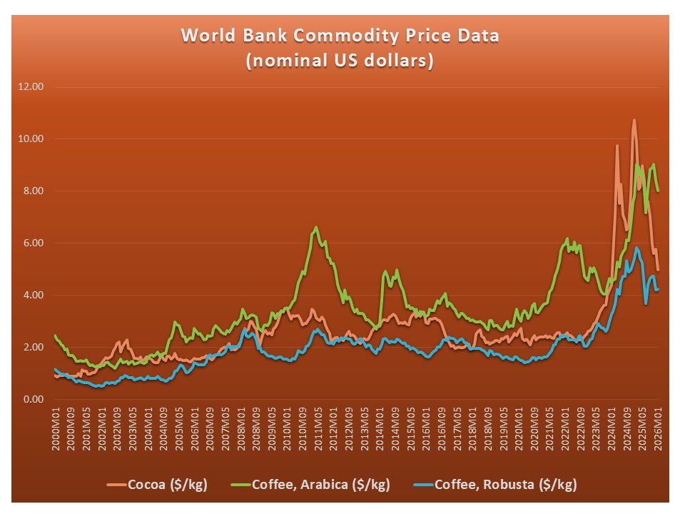 近年、国際カカオ価格は高騰し、世界銀行データによると、2025年1月には1キログラムあたり10.75ドルと史上最高値を記録、前年同月比で2.5倍、2年前同月比で約4倍まで高騰しました。その後、国際価格は下落をはじめ、2026年1月では1キログラムあたり4.97ドルと、前年同月比で半分近く価値が下落しています。