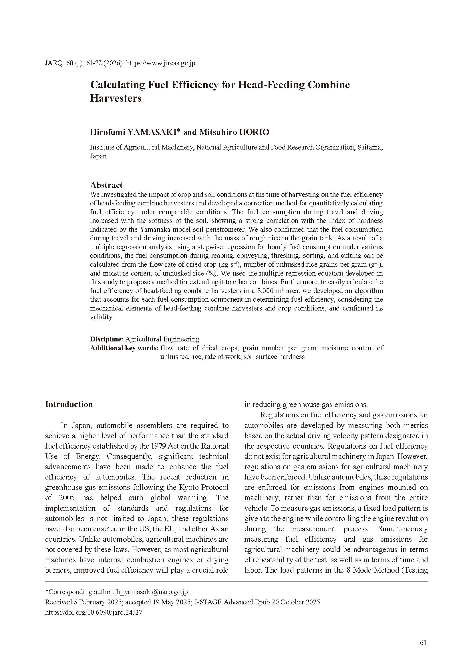 We investigated the impact of crop and soil conditions at the time of harvesting on the fuel efficiency of head-feeding combine harvesters and developed a correction method for quantitatively calculating fuel efficiency under comparable conditions. The fuel consumption during travel and driving increased with the softness of the soil, showing a strong correlation with the index of hardness indicated by the Yamanaka model soil penetrometer. We also confirmed that the fuel consumption during travel and driving increased with the mass of rough rice in the grain tank. As a result of a multiple regression analysis using a stepwise regression for hourly fuel consumption under various conditions, the fuel consumption during reaping, conveying, threshing, sorting, and cutting can be calculated from the flow rate of dried crop (kg s–1), number of unhusked rice grains per gram (g–1), and moisture content of unhusked rice (%). We used the multiple regression equation developed in this study to propose a method for extending it to other combines. Furthermore, to easily calculate the fuel efficiency of head-feeding combine harvesters in a 3,000 m2 area, we developed an algorithm that accounts for each fuel consumption component in determining fuel efficiency, considering the mechanical elements of head-feeding combine harvesters and crop conditions, and confirmed its validity.