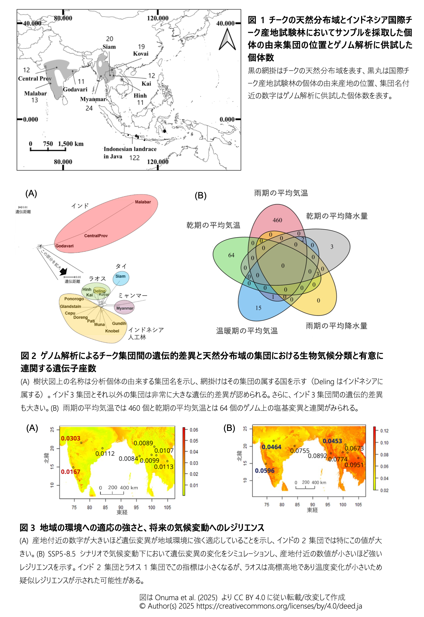 - 本成果は、将来の気候条件を考慮したチーク植林の産地選定や遺伝資源管理に活用でき、特にインドネシアの人工林を気候変動に適応させるための科学的根拠を提供する。