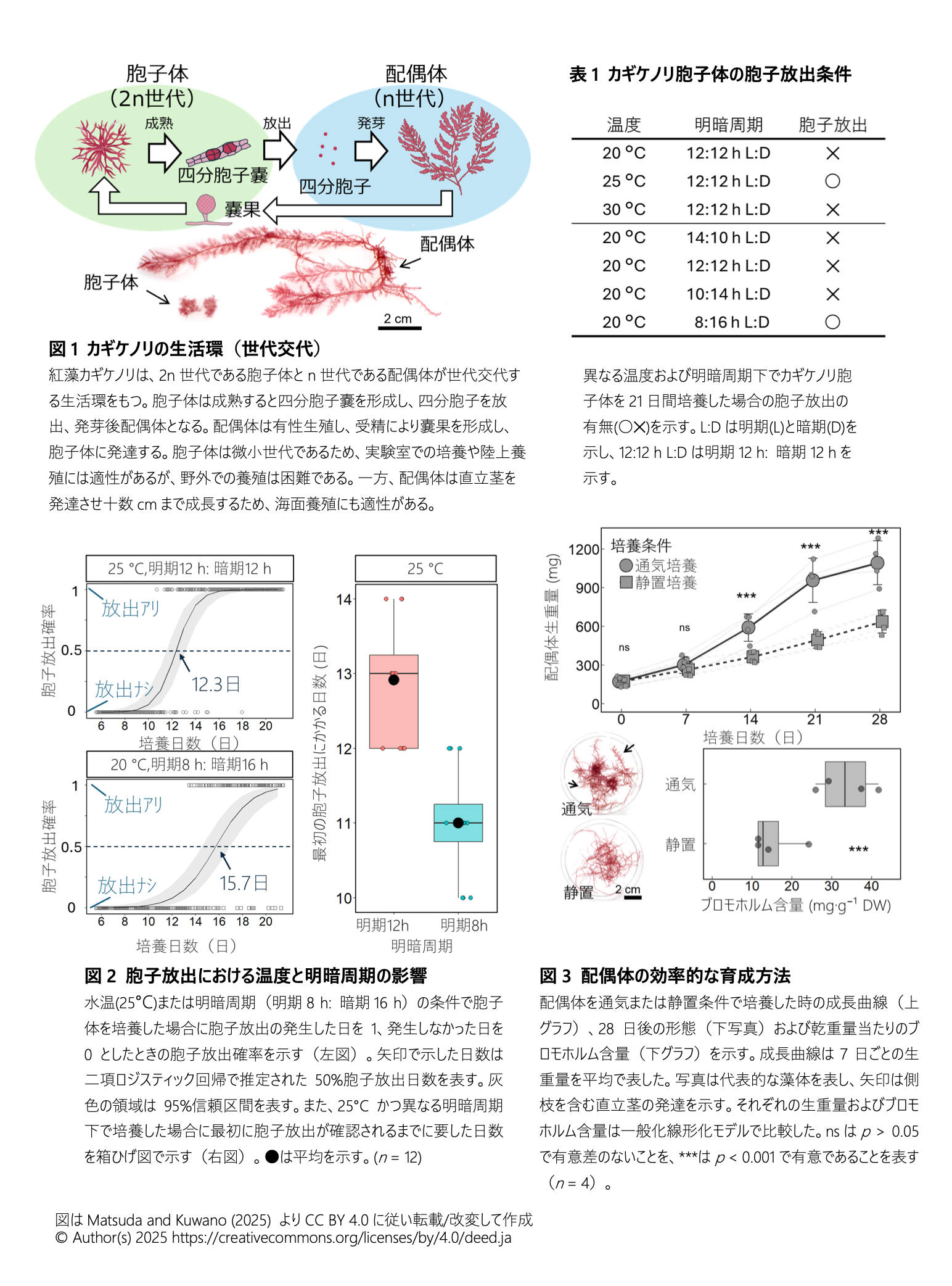 - 本種の胞子体は水温20°C、昼夜等長の明暗周期(明期12 h: 暗期12 h)で安定的に維持されるが、これを水温25℃または短日の明暗周期(明期8 h: 暗期16 h)下で維持することで、成熟および四分胞子の放出を誘導できる。一方、これら以外の条件では、胞子体の成熟および胞子の放出は認められない(表1)。最初の胞子放出までに要する日数の平均は、水温25℃条件では12.3 ± 1.07日、短日条件(明期8 h: 暗期16 h)では15.7 ± 1.31日である(図2左)。また、これら2条件は独立して胞子放出誘導に機能するが、同時に付与することで相乗効果となり、水温を25℃とした場合、最初の胞子放出までに要する日数の平均は昼夜等長条件(明期12 h: 暗期12 h)では12.9 ± 0.79日に対し短日条件(明期8 h: 暗期16 h)では11.0 ± 0.74日となり約2日短縮される(図2右)。