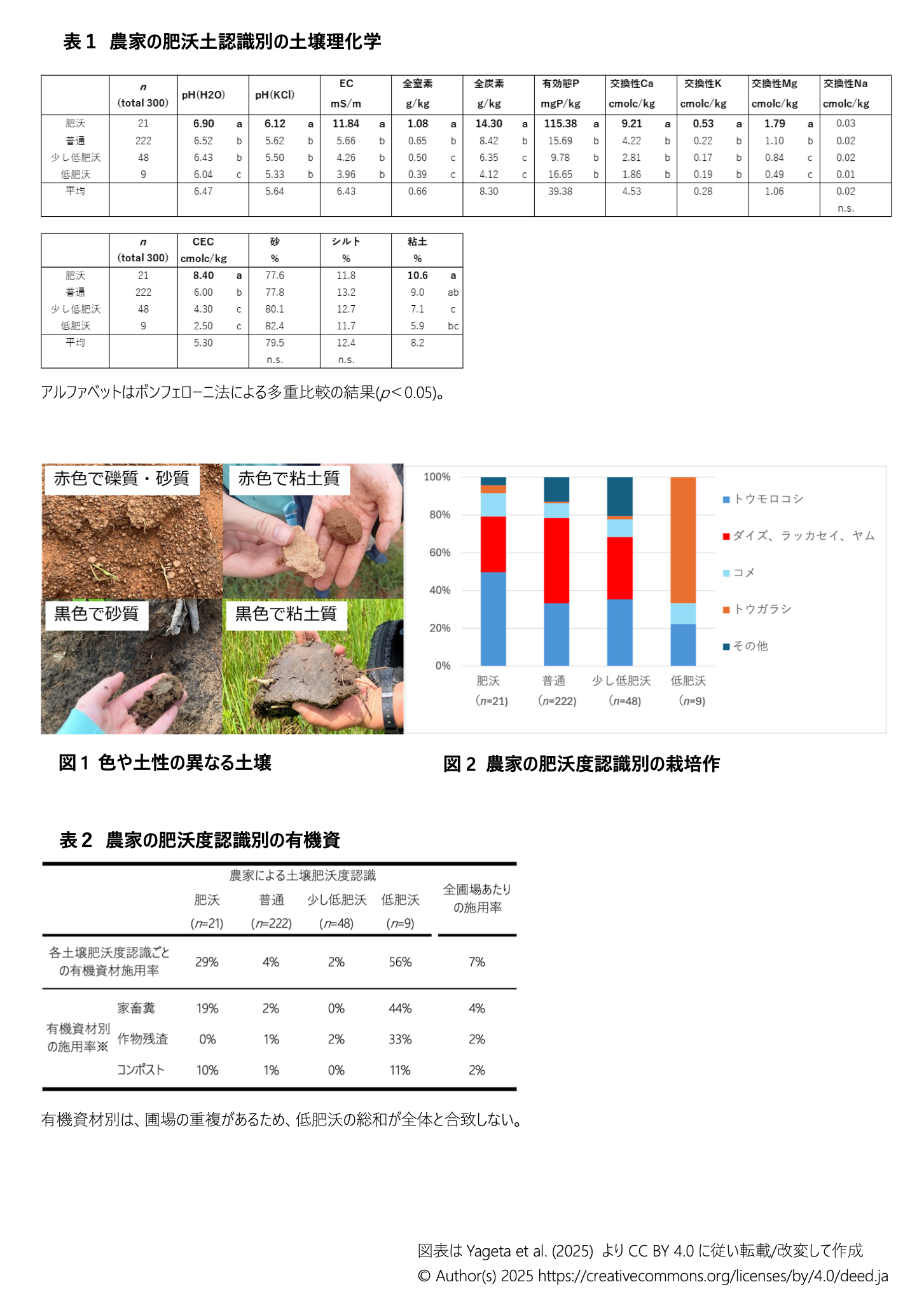 - 農家の土壌肥沃度認識において、肥沃度が高い土壌ほど、pH、電気伝導度(EC)、全炭素、全窒素、有効態リン酸、交換性陽イオン、交換性陽イオン容量(CEC)の値が高い(表1)。例えば、肥沃度が高いほど全窒素量の平均値は有意に高く、肥沃(1.08 g kg⁻¹)>普通(0.65)>少し低肥沃(0.50)>低肥沃(0.39)の順に低下する。