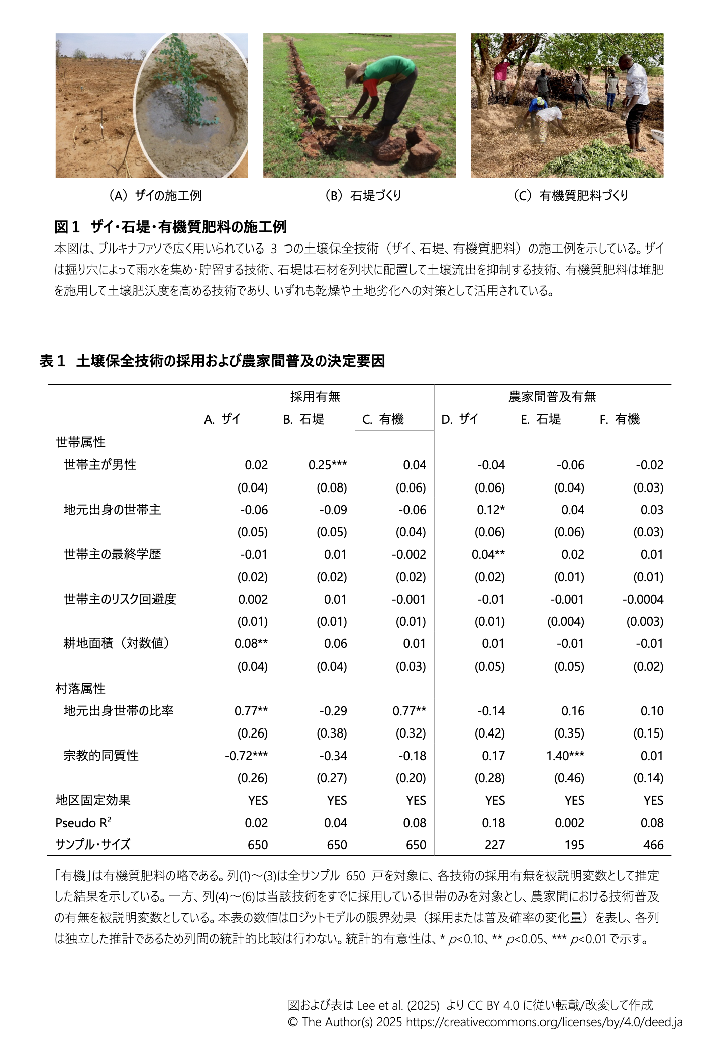 西アフリカのブルキナファソでは、降雨の不安定化や過耕作が進み、土壌劣化が深刻な問題となっている。これらの課題に対処するため、農家はザイ(掘り穴による雨水の収集・貯留技術)(図1A)、石堤(列状に配置した石材で土壌流出を抑える技術)(図1B)、有機肥料(図1C)といった伝統的な土壌保全技術を実践している。しかし、その普及は限定的である。普及が広がらない要因の一つは、公的普及制度における農業普及員の慢性的不足である。その補完策として、農家が隣人に技術を伝える「農家間普及」が注目されているが、その成立条件や技術ごとの伝播経路に関する実証的知見が不足している。