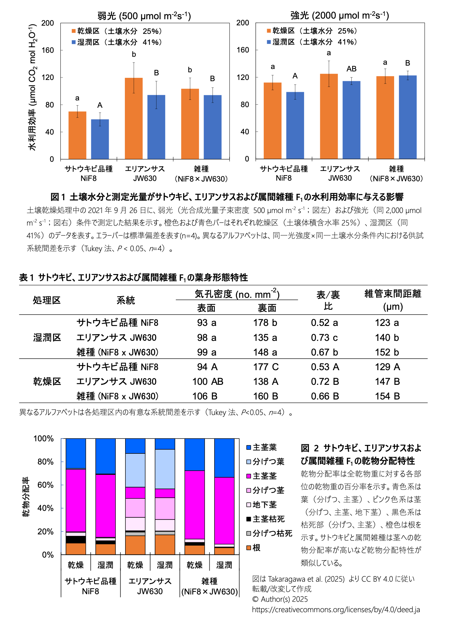 - 属間雑種の水利用効率および気孔密度は、エリアンサス親と同等か近い値を示す(図1、表1)。一方、属間雑種は茎への乾物分配が大きく、乾物分配はサトウキビ親に近い傾向を示す(図2)。