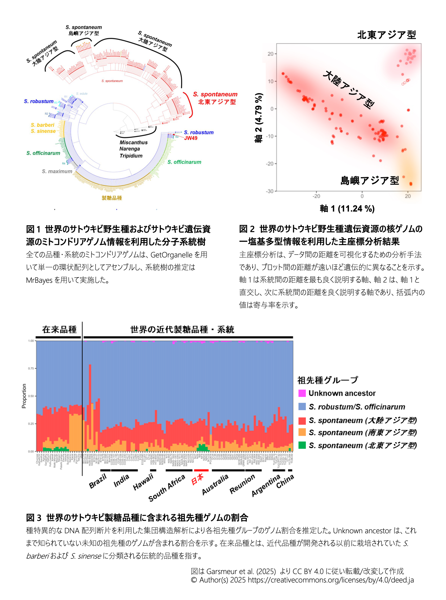 - 世界で栽培されている近代サトウキビ品種の遺伝的背景には、大陸アジア型や島嶼アジア型野生種のゲノムが多く含まれているが、北東アジア型野生種のゲノムはほとんど含まれておらず、わずかに日本および中国の品種で確認されるのみである(図3)。