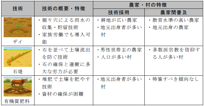 本研究では、ブルキナファソ中部のソルガム農家650戸を対象に、伝統的な土壌保全技術であるザイ2)(掘り穴による雨水の収集・貯留技術)、石堤3)(列状に配置した石材で土壌流出を抑える技術)、有機質肥料の採用や伝搬の実態を解明するために、技術の採用程度を数量的に分析する統計手法 (ゼロ切断トービットモデル4)) および採用するか否かといった二者択一の選択行動を解析するモデル (ロジットモデル5)) を用いて統計的に分析しました。