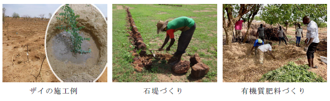 - 西アフリカの乾燥地で古くから使われている伝統的な土壌保全技術です。直径30cm程度、深さ20cm程度の穴を掘り、その中に種や苗木を堆肥とともに入れます。元は荒廃した傾斜地に植林をするための技術でしたが、後に畑でも利用されるようになりました。小さな穴によって雨水を効率的に収集・貯留することができるため、雨水による土壌侵食を抑えながら、堆肥により土壌肥沃度を高める効果もあります。