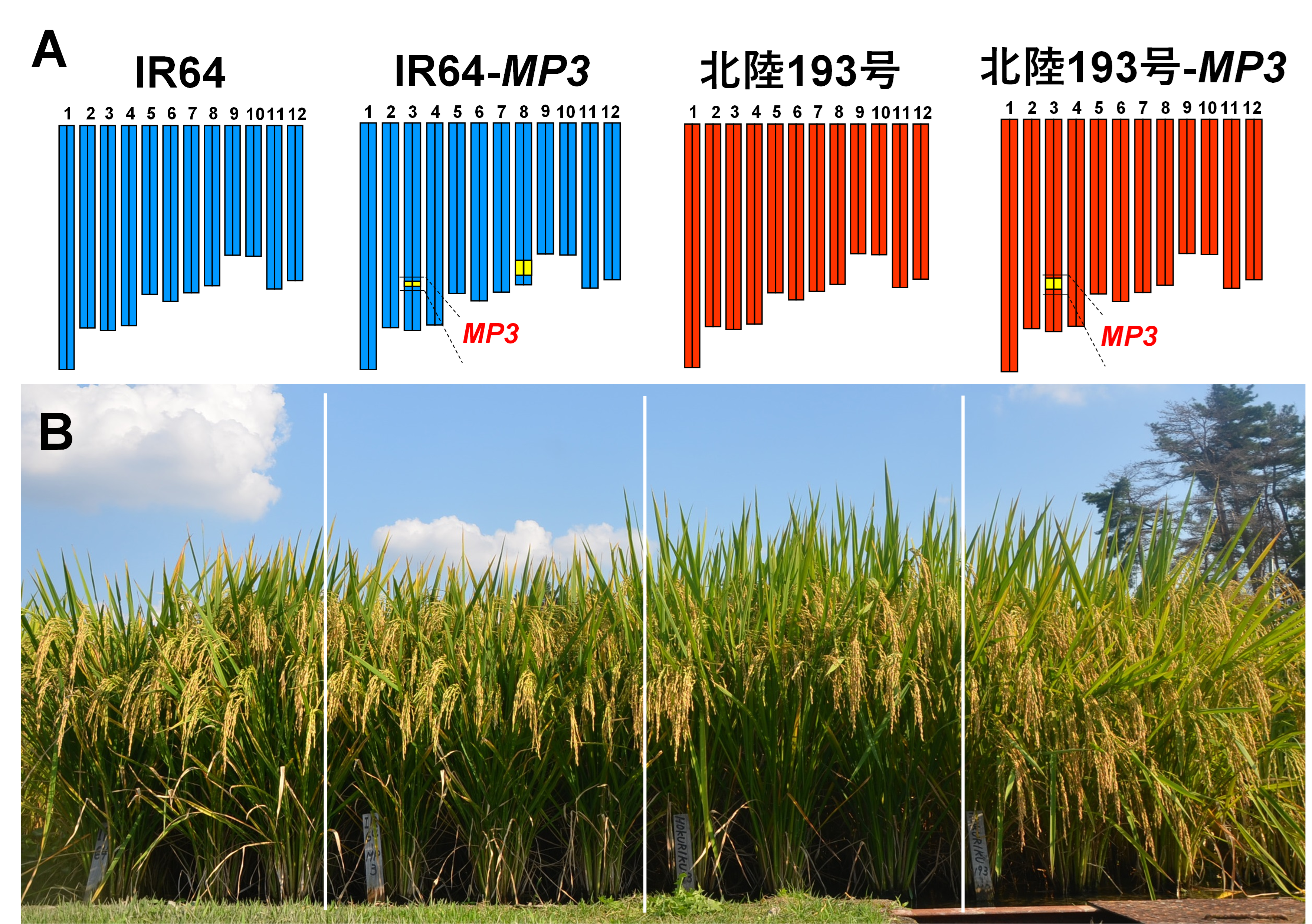 - 「コシヒカリ」に「IR64」および「北陸193号」を複数回戻し交配し、後代を選抜した結果、MP3領域が「コシヒカリ」由来の「IR64-MP3」と「北陸193号-MP3」を開発しました (図1A)。