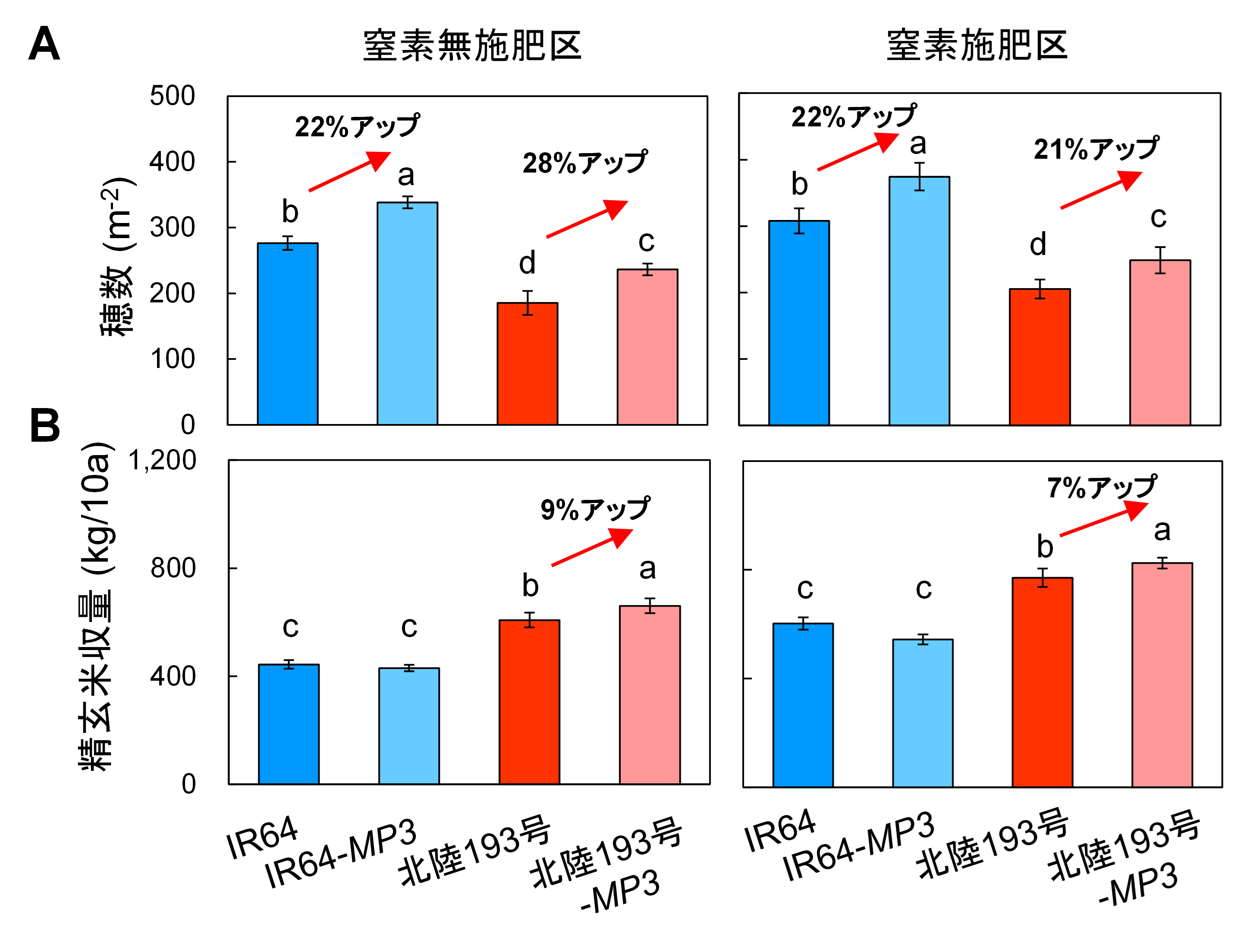 - 栽培試験の結果、窒素施肥の有無にかかわらず、MP3遺伝子を導入した「IR64-MP3」と「北陸193号-MP3」の穂数は、親品種と比較して、それぞれ22%と21~28%増加しました (図2A)。さらに、「北陸193号-MP3」の精玄米収量は「北陸193号」と比較して、窒素施肥 (8kg/10a) では、770kg/10aから825kg/10aへ約7%増加、窒素無施肥区でも608kg/10aから660kg/10aへ約9%増加しました (図2B)。なお、「IR64-MP3」と「IR64」の間では精玄米収量に顕著な差は観察されませんでした。