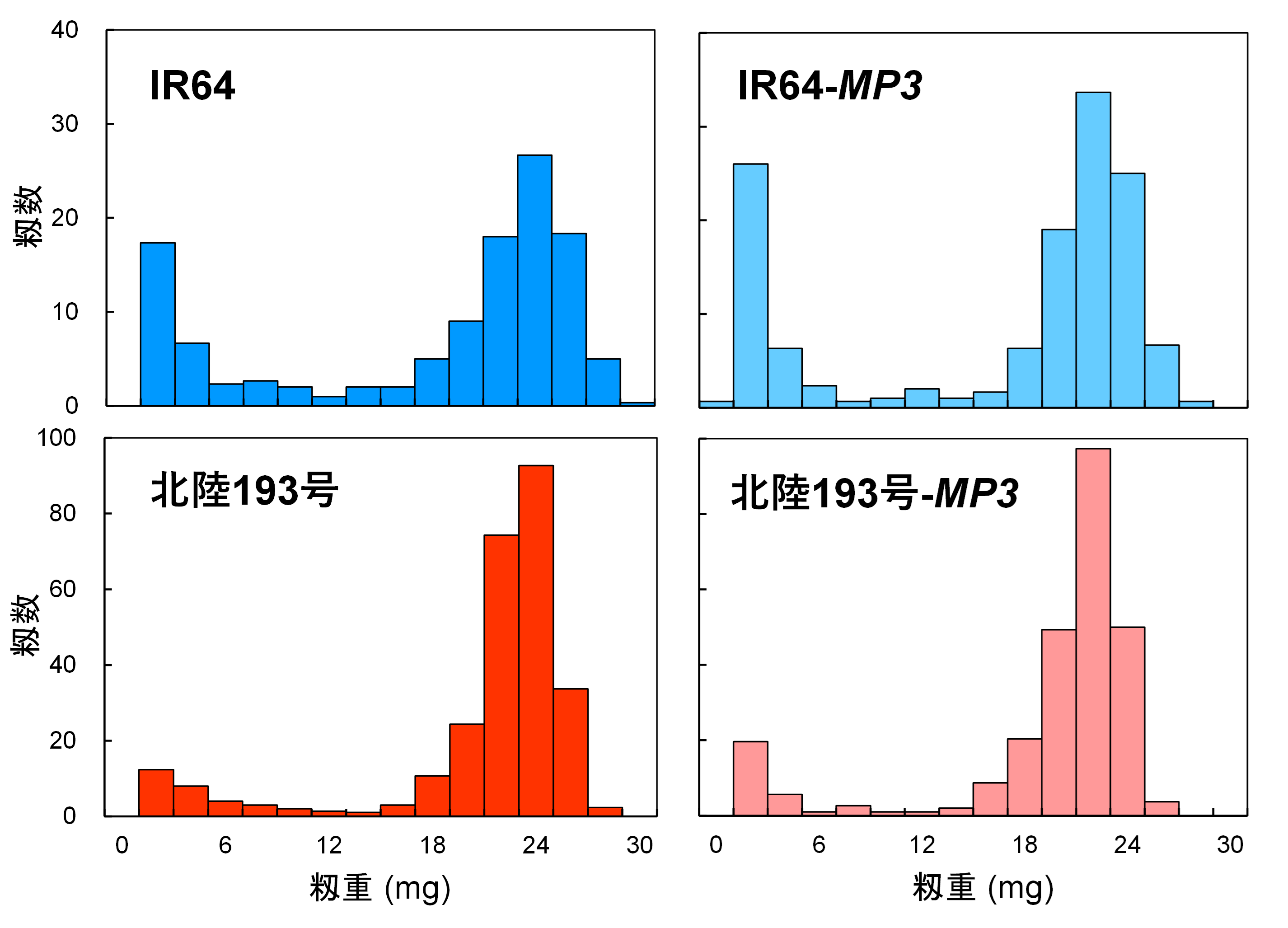 - 一穂内の籾重調査により、「北陸193号」と「北陸193号-MP3」は、籾重6mg以下のしいな (空籾) の割合が共に約11%であったことから、「北陸193号-MP3」では穂数増加に伴う籾の稔実率の低下が無いことが確認されました (図3)。一方、「IR64-MP3」のしいなは26%であり、「IR64」の22%よりも稔実が悪くなりました。